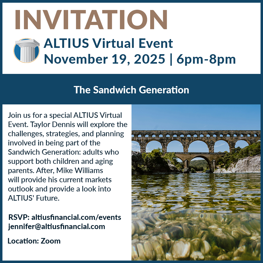 Many families today are navigating the complex demands of multigenerational caregiving. Often referred to as the Sandwich Generation, this group includes adults who are caring for both their children and aging parents at the same time. In this workshop, Taylor Dennis will explore the challenges of balancing these responsibilities, provide strategies for supporting loved ones at both ends of the age spectrum, and discuss how everyone in the family can play a role in creating a more sustainable caregiving dynamic and a stronger plan that aligns with your financial plan. After Taylor's presentation, Mike Williams will discuss recent economic and geopolitical developments and provide an update on ALTIUS' current strategies and insight into ALTIUS' future.