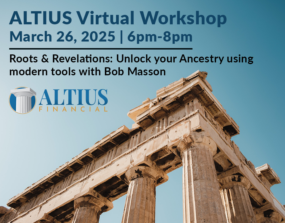 This virtual workshop will include a special session on genealogy, Roots & Revelations, by Bob Masson. Then, Mike will cover recent economic and geopolitical developments and updates to ALTIUS’ strategy. We look forward to seeing all of you on zoom. Join us for a fun workshop!